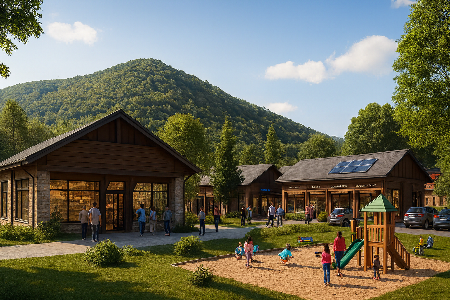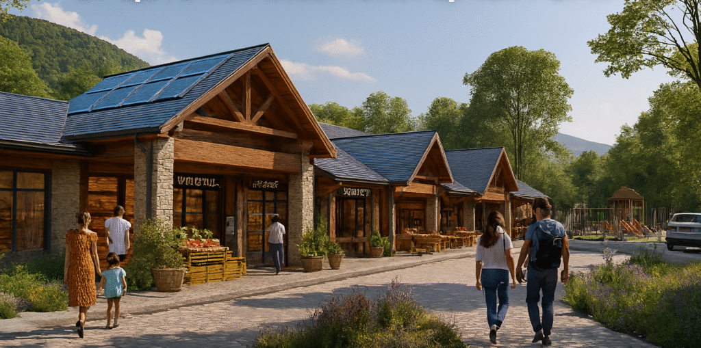 Ова не е класичен бетонски мол, туку објект изграден во стил на „mountain village design“ – со дрво, камен и стакло, целосно вклопен во природата и духот на Скопска Црна Гора. Целта е да изгледа како дел од амбиентот, а не како наметнат градски објект.